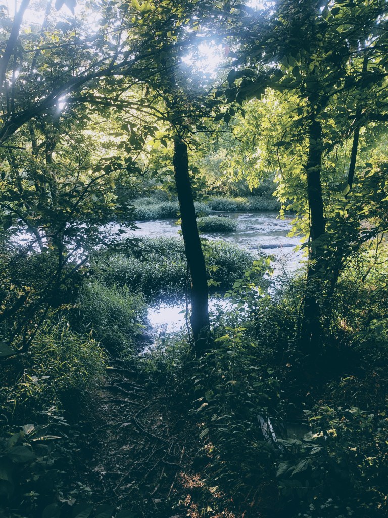 And then we see it. A glimpse, anyway. A little bit of light peeking in through the trees that are shrouding light and sky and the things beyond. We hear the sound of dancing water running steadily on…
